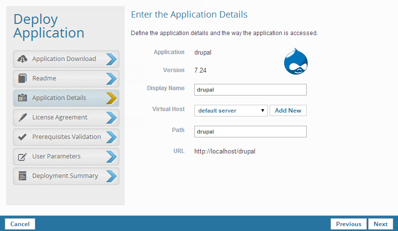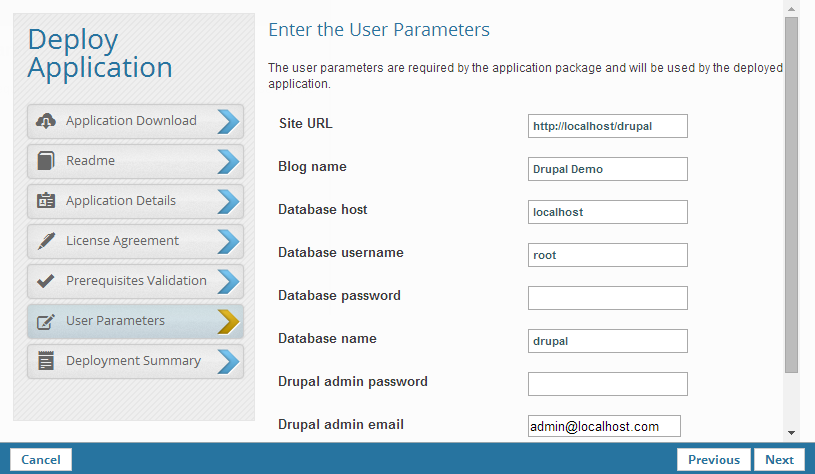 The uploaded package determines which of the wizard dialogs are enabled. Deployment steps that were not defined in the application's XML descriptor file will be ignored by the wizard.