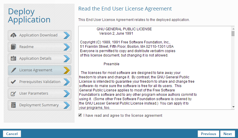 1. If you specified a EULA in your application package, the License Agreement dialog is displayed.