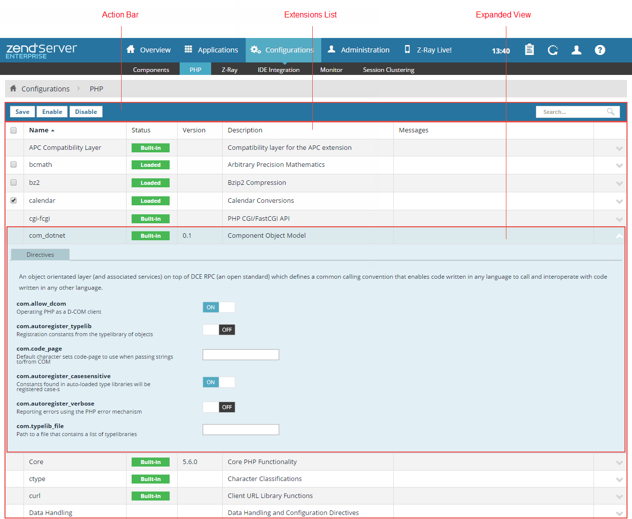 The PHP page is accessed from Configurations | PHP, and lists the PHP extensions included with the Zend Server installation and extensions added to the php.ini by the user, and their related directives. Use the PHP page to view the status of all your extensions, to quickly and easily load and unload extensions, and configure directives associated with certain extensions.