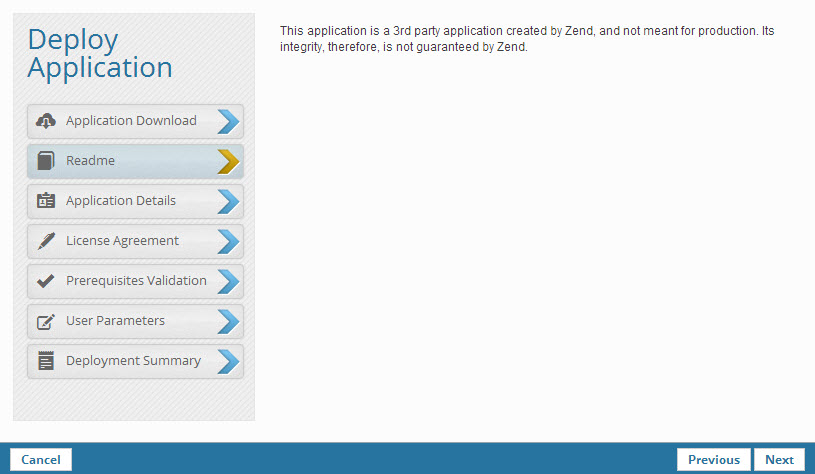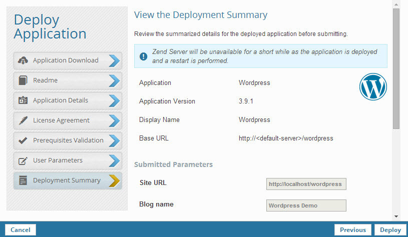 Once launched, you have full access to all Zend Server features for a period of 30 days. The Getting Started tutorial will help you get started with some of these features. Our next step is to deploy one of the demo applications Zend Server supplies - Wordpress.