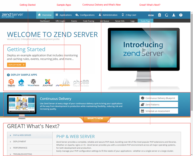 The Guide Page helps users, both first-timers and those already acquainted with Zend Server, to understand the full range of Zend Server's capabilities.