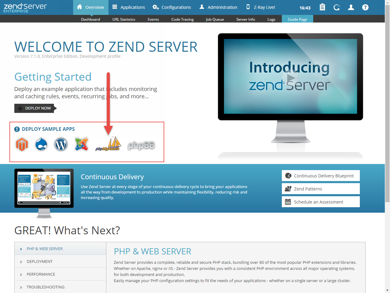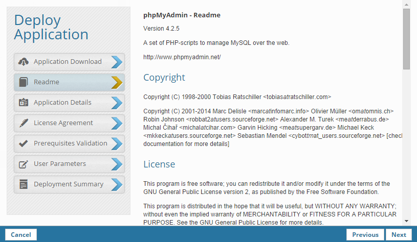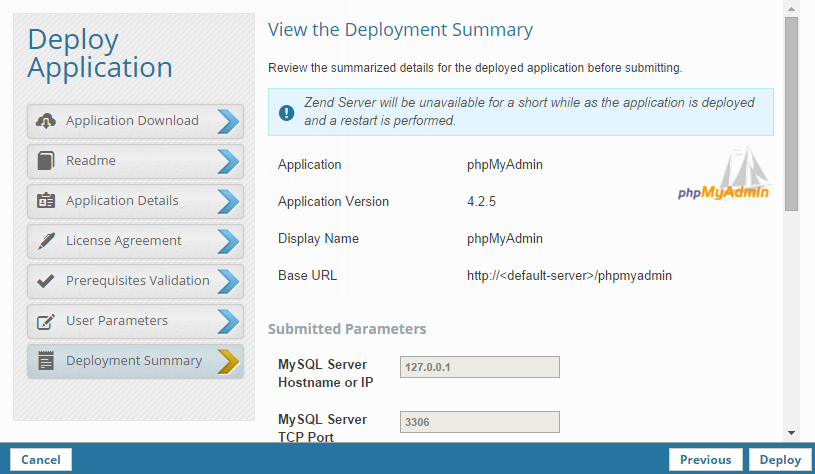 This procedure describes how to download and deploy the phpMyAdmin application package on Zend Server.