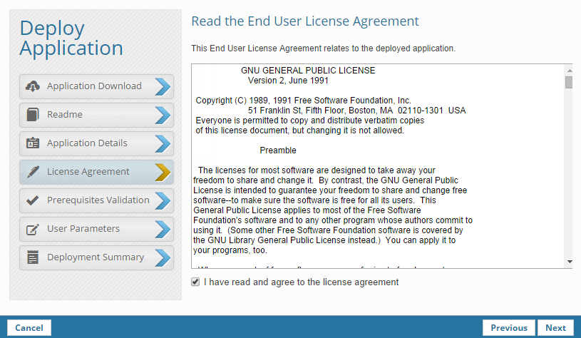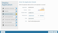 Note: The base URL (or root URL) is the URL where the application is available after it has been deployed. The base URL is unique and cannot be shared between two applications, and each application is required to have a base URL. Using a pseudo URL is also acceptable. When finished, click Next. The License Agreement dialog displays.