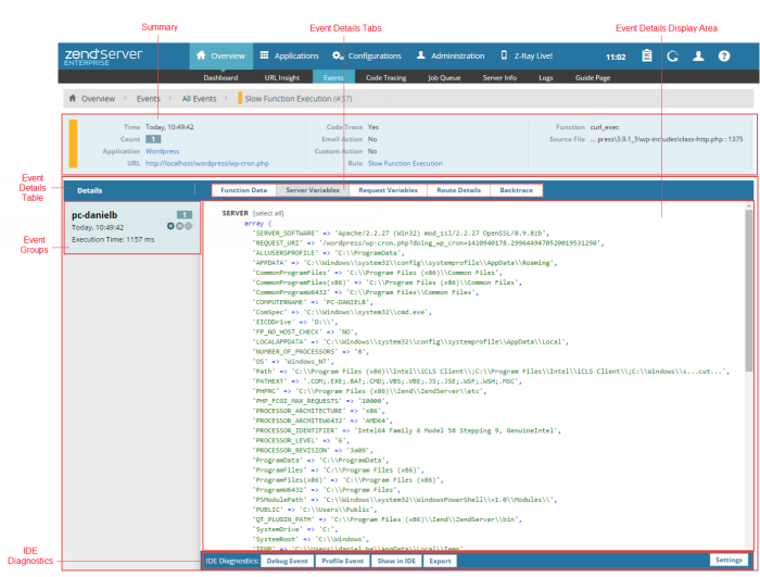 The Event Details page is accessed from the Events page or the Dashboard page by selecting an event ID from the Events list , or by clicking More Details in an event's expanded view. The page contains all the available monitored event-related information and details, and Zend Studio diagnostic tools.