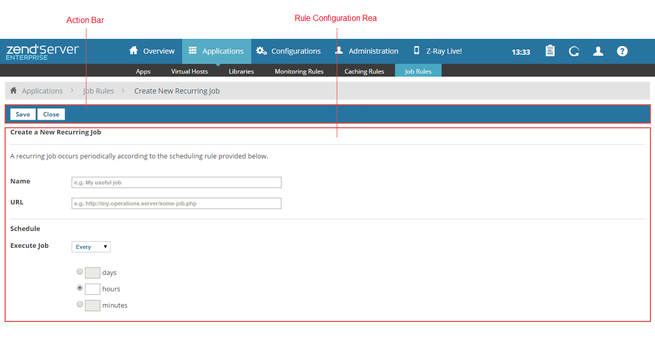 The action bar is located at the top of the page, and is used to save or cancel changes made to a scheduling rule: