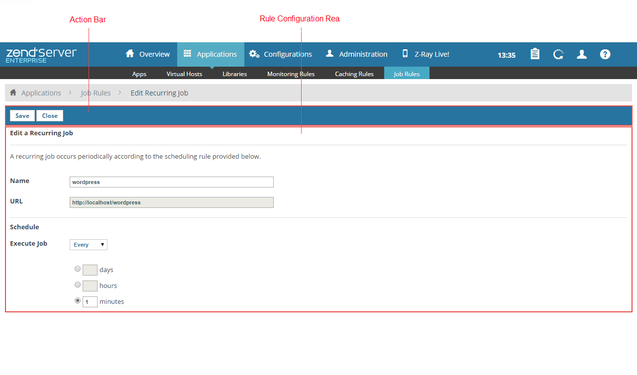 The action bar is located at the top of the page, and is used to save or cancel changes made to a scheduling rule: