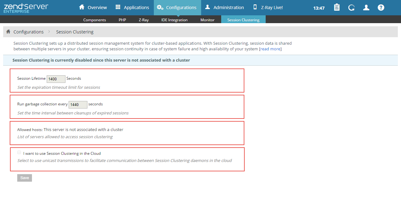 The Session Clustering page is accessed from Configurations | Session Clustering, and contains configuration settings for the Zend Session Clustering component.