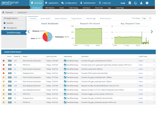 The Zend Statistics component is an additional monitoring tool that collects and displays important statistical data in the UI, enabling you to closely keep track on how your deployed applications and servers are performing. This information is collected by the various Zend Server components, and reflected in a series of metrics displayed in graphical charts on the Overview | Dashboard page.