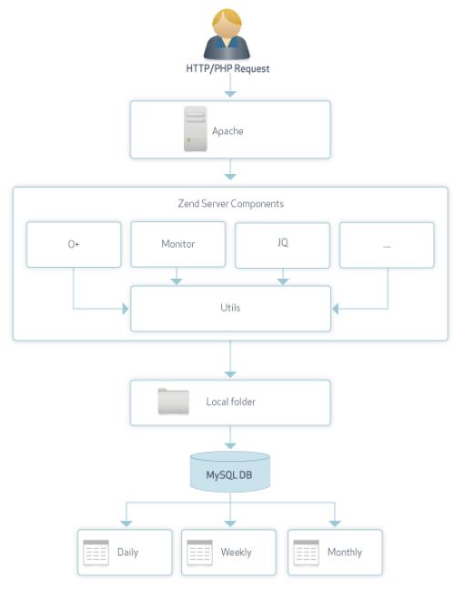 The Zend Server components are responsible for reporting and gathering the data displayed in the UI. The data is aggregated by the components and placed on your disk in the form of binary files. The data is then gathered by the zdd (Zend deployment daemon) and converted into entries in three tables on the your server's MySQL database. These tables represent the time resolution in which the data is stored (daily, weekly and monthly). Outdated data (For example, data older than a month for the monthly table) is deleted and replaced by newly aggregated data.