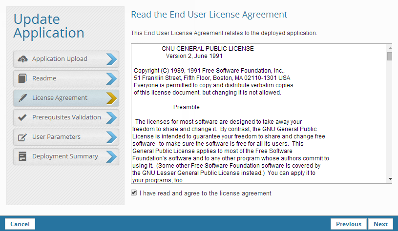 1. If you specified a EULA in your application package, the License Agreement dialog is displayed.