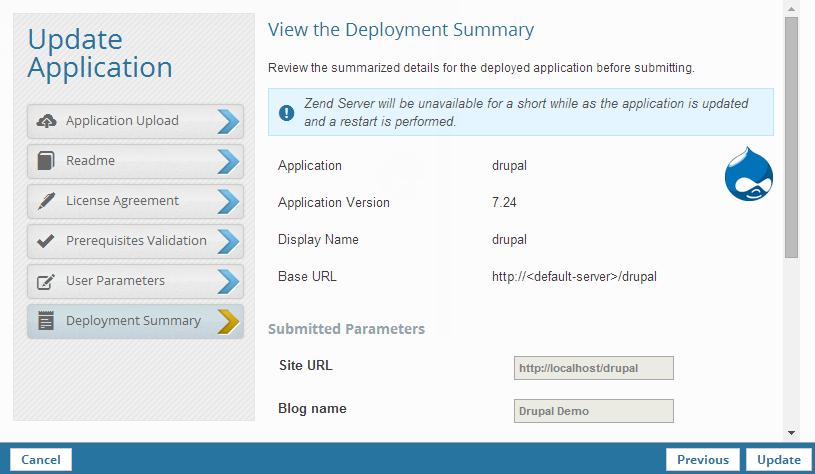 1. The Deployment Summary dialog displays a summary of the parameters you have defined for your application. To change anything on this page, click Previous and change it on the dialog it appears. Otherwise, click Update to deploy your application.