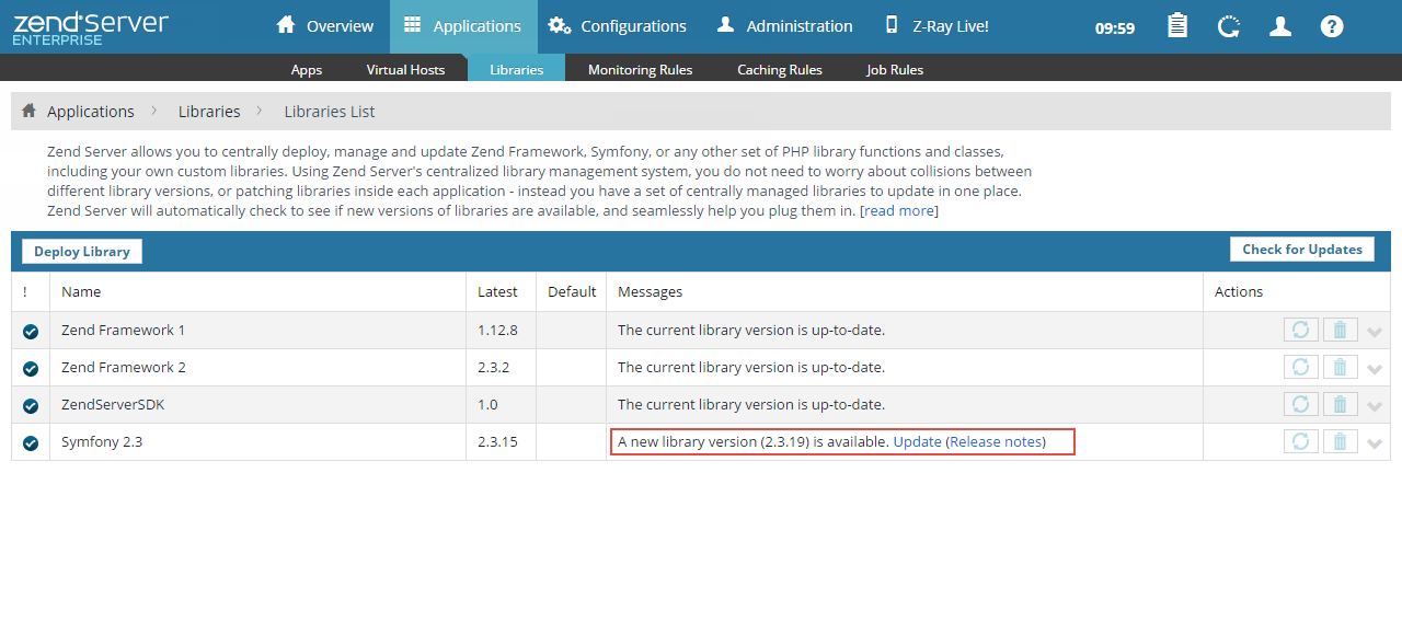 Zend Server will check the update library repository for available updates. If there are any available updates, they are displayed in the Messages column in the Libraries list.
