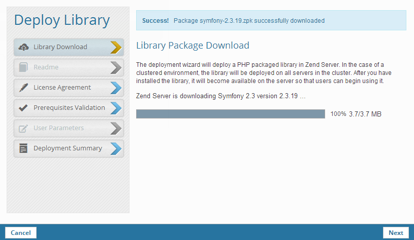 The Deploy Library wizard is displayed, and Zend Server downloads the library package. If this process fails, you can either retry, or manually download and deploy the library. Note: Zend Server will fail to download the library package if the Automatic Download feature is disabled. In this case, you will be directed to either enable the feature ('zend_deployment.auto_download' directive) from the Configurations | PHP page, or manually download the package for deployment.