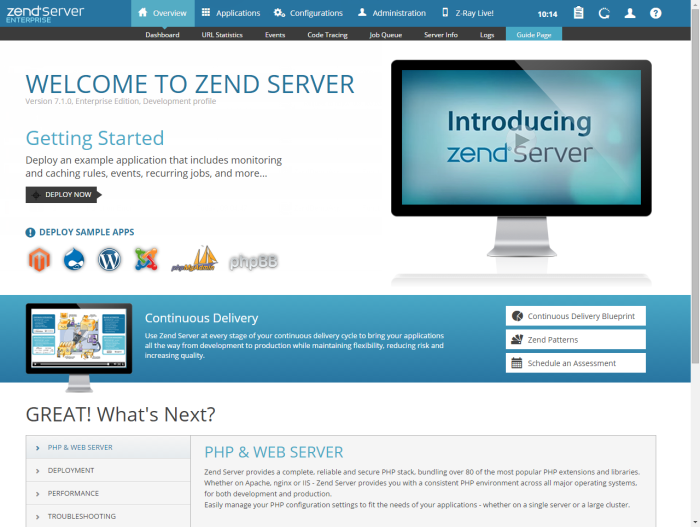 Zend Server's UI has been designed to enable you to interact more naturally with Zend Server and is centered around your applications, making it easier for you to manage, monitor and develop your applications in a seamless process. The UI displays statistical graphs per application, allows you to manage and configure rules per application, and also provides a way to integrate existing applications into the Zend Server management system.