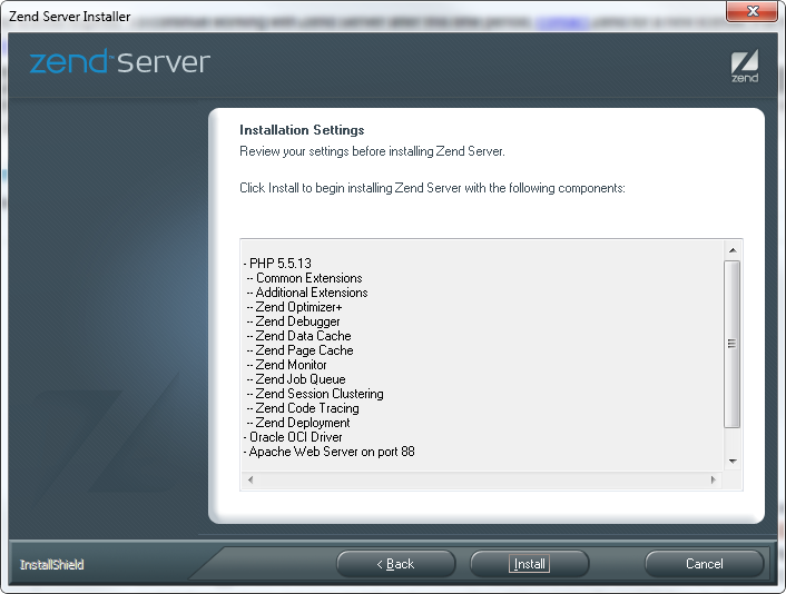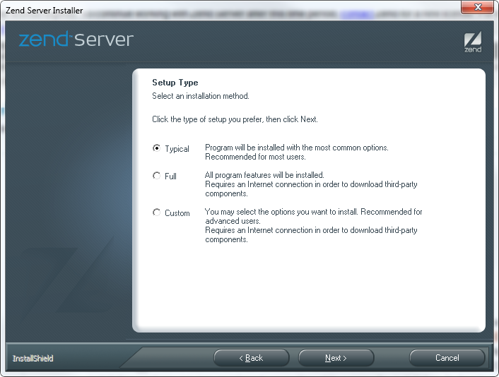 • The Full installation type installs all components included in the installation package. The components are Zend Optimizer+, Zend Loader, Zend Debugger, Zend Cache, Java Server, Zend Framework, Oracle OCI Driver, IBM DB2 RTCL,  Monitor, Page Cache and MySQL. The full installation package requires an Internet connection while running the installation, to download online components.
