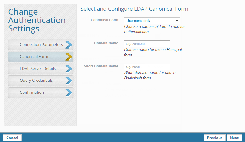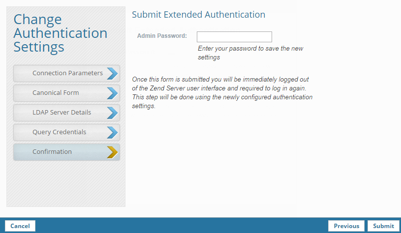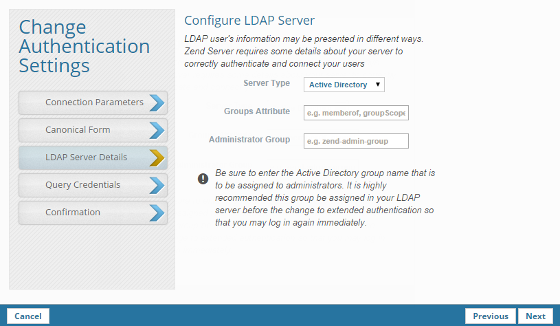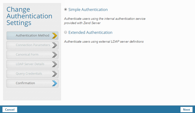 Simple Authentication is the default authentication method in Zend Server. This procedure explains how to change to Extended Authentication. If you want to use LDAP over SSL, see Configuring LDAP over SSL or TLS.