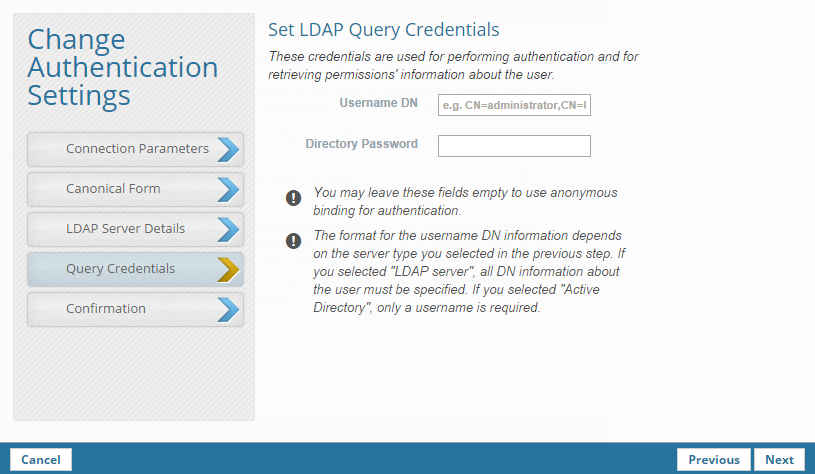Note: The format for the username DN information depends on the server type you selected in the previous step. If you selected "LDAP server", all DN information about the user must be specified. If you selected "Active Directory", only a username is required.