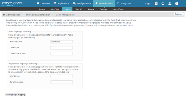 Zend Server's Extended Authentication method allows administrators to assign a Zend Server user role (e.g., Developer) to an LDAP user group , awarding all users in the group all the associated user role permissions. This feature is especially useful for administrators with more than one remotely defined LDAP user groups, to whom he would like to assign different Zend Server user permissions.
