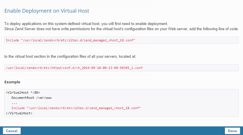 Applications can only be deployed on virtual hosts managed by Zend Server. Deployment to a system-defined virtual host can only be performed once deployment is enabled. For more information, see Enabling Deployment below.